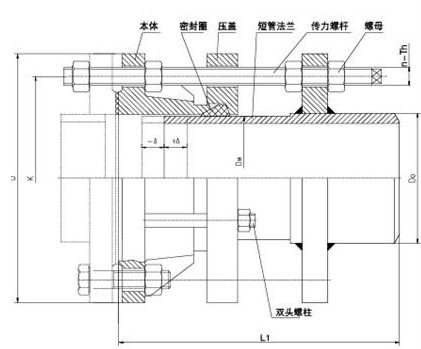 松套傳力接頭是在法蘭松套補償接頭的基礎上增設法蘭短管及傳力螺桿而成,次類型的補償接頭與松套補償接頭和松套限位補償接頭不同的是它的補償量是指在安裝及拆卸過程中的調節量,一旦將所有的螺母擰緊,它是剛性連接的,可以傳遞軸心力,從而保護閥門、泵等設備。